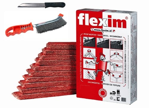 Complete set voor het vastleggen van nokvorsten en dakpannen. De Flexim dakmortel rood set bevat alles wat nodig is voor een snelle, duurzame en waterdichte afwerking van het dak.