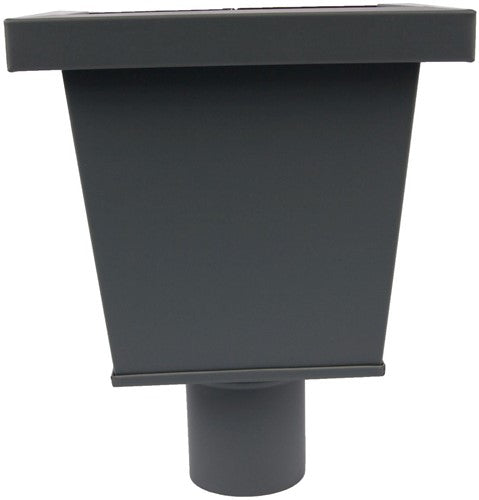 Compacte aluminium vergaarbak in K2 Mat Lei Grijs (RAL 7015) voor het efficiënt opvangen en afvoeren van regenwater naar Ø80-mm regenpijpen.